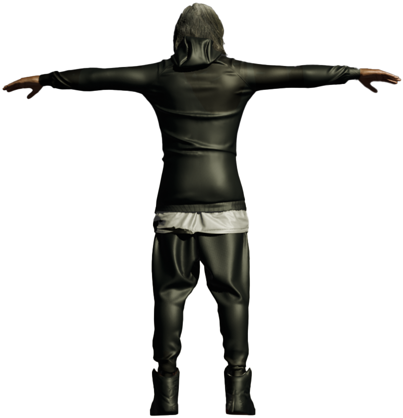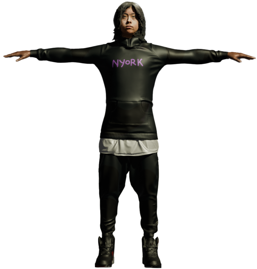For this character design, we used PolyCam to scan my partner’s head, creating a high-resolution 3D model. Once captured, we merged the PolyCam mesh with a custom-built human figure sourced from Mixamo, applying custom rigging and color mapping to achieve a fully personalized and cohesive character. This process allowed us to blend real-world likeness with a stylized digital body for a unique and expressive result.