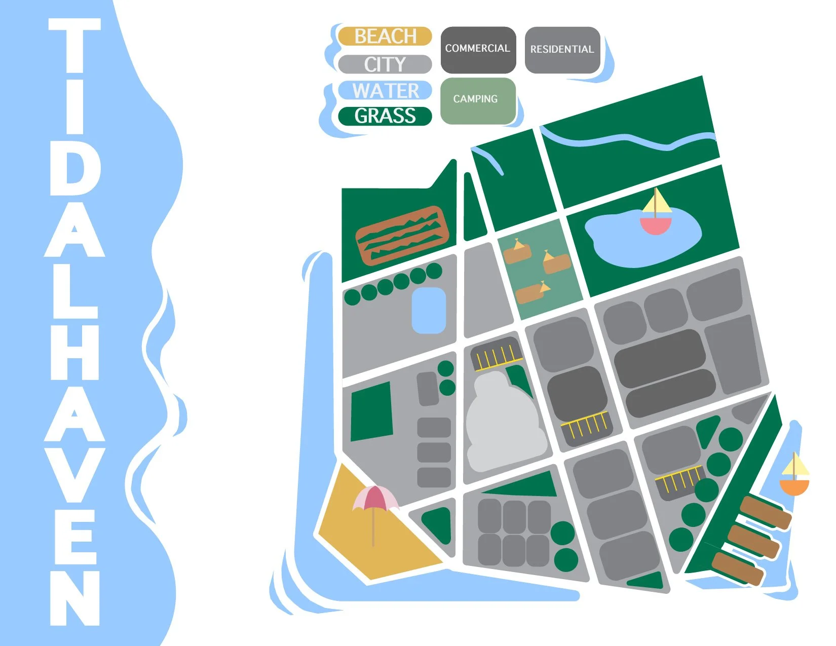This stylized city map was created in Adobe Illustrator to represent a fictional coastal town using simple shapes, icons, and a clear color system. The design focuses on visual clarity rather than realism, with different zones like water, parks, residential, commercial, and beach areas communicated through consistent colors and symbols. The map demonstrates skills in vector illustration, layout, and information design.