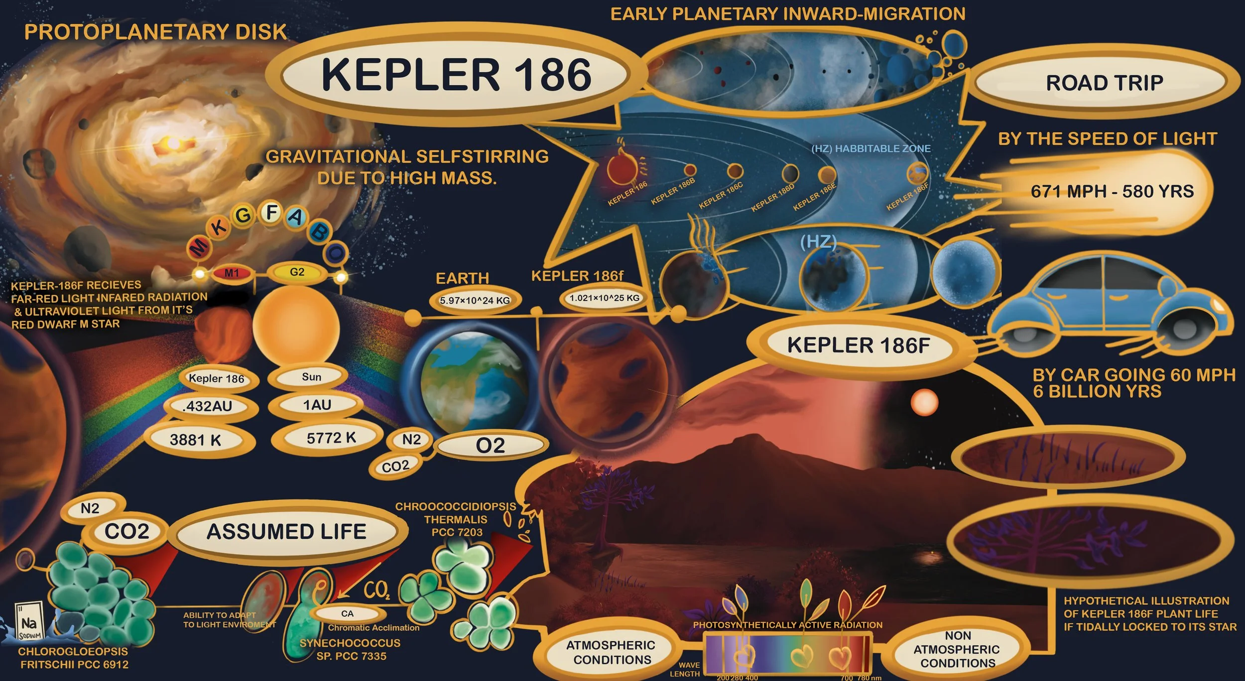 This project was made to explore the idea of life in the universe. In an Astrobiology class we individually explored how life can inhabit a planet of our choice. I chose Kepler-186 for its vast amount of scientific information collected to hypothesize the possibility of life on its surface. This infographic shows the beginning of life for this planet, shows its planet placement and gives examples and comparison to our planet and this particular one, Kepler-186.